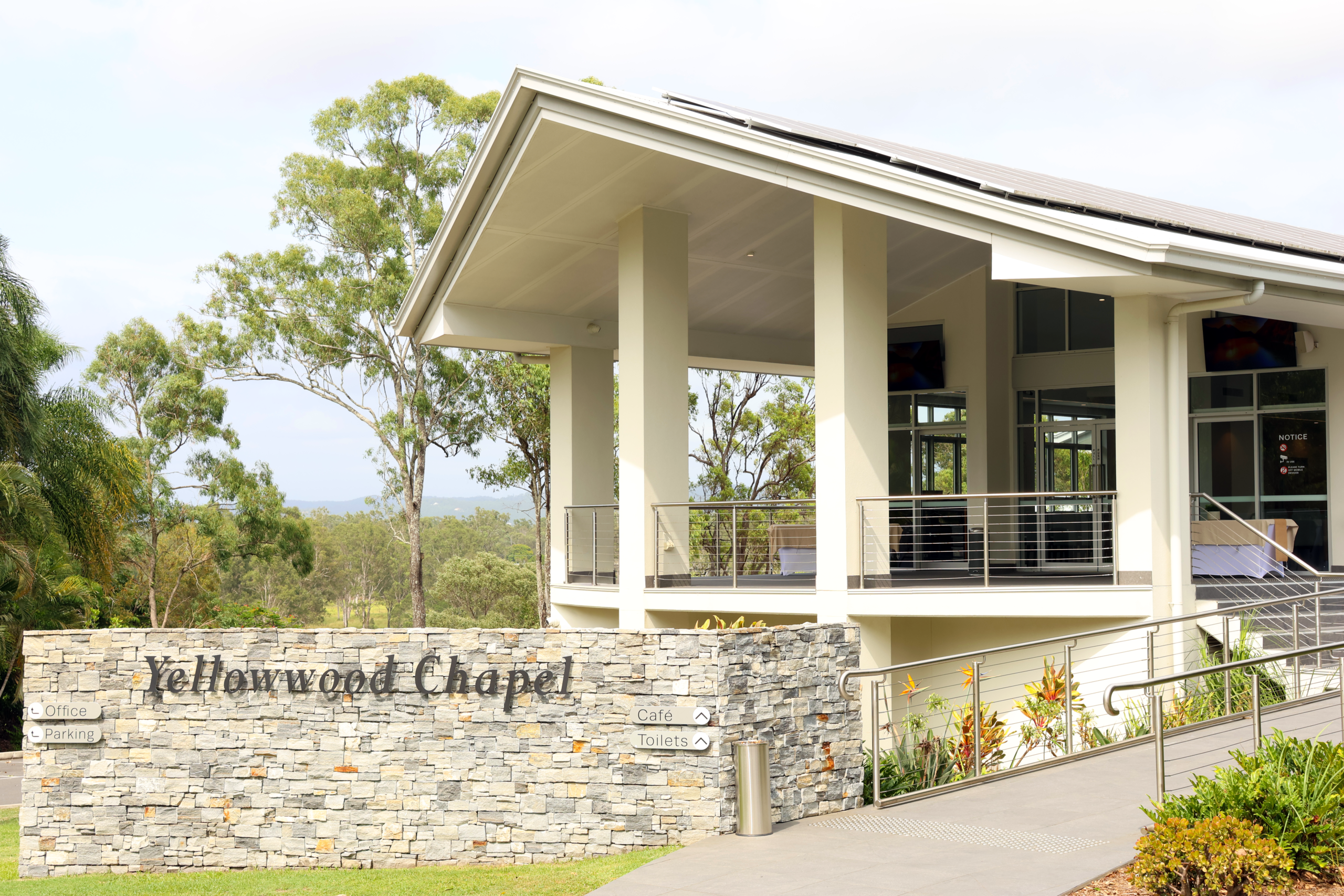 Experience the tranquillity as you sit in our air conditioned chapel on modern comfortable pews and gaze through the tree tops to the distant hills beyond.